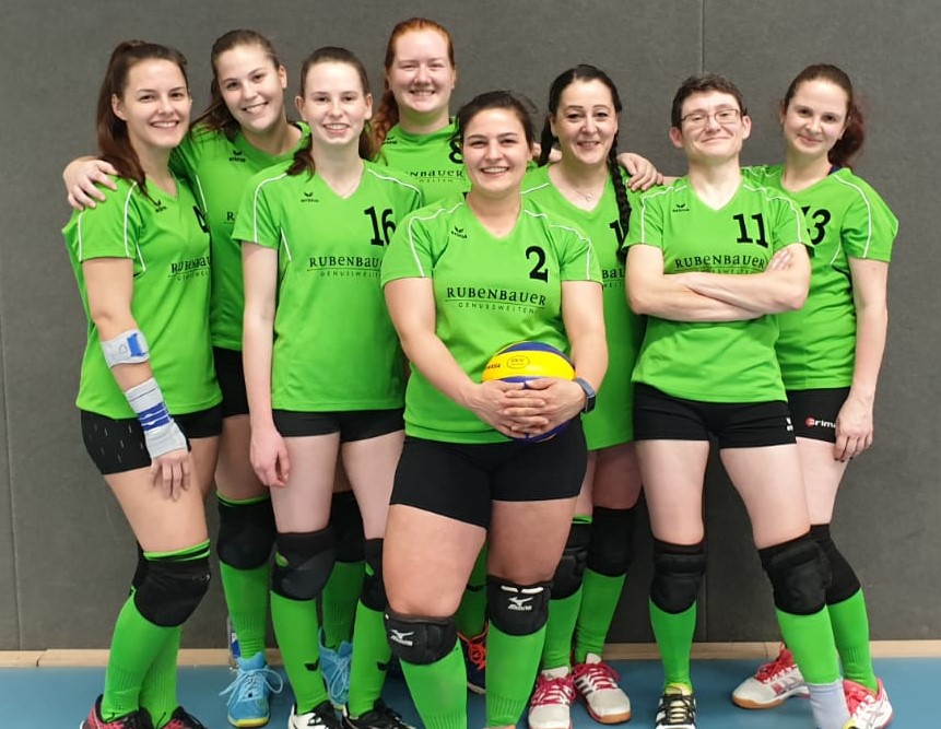gehen. Auf Wunsch tauschte Uli Reinle Vreni T. für den 3. Satz gegen Becks M. im Hauptangriff aus. Von dem Motivationskärtchen „Wir wollen gewinnen“ angespornt entschied die Mannschaft den Satz mit 25:22 für sich. Satz 4 ging sogar mit 25:19 an die Gäste aus Pforzheim. Nun musste der Tiebreak entscheiden. Der eine Punkt war der SG jedoch schon sicher. Die größten Schwierigkeiten bereiteten der SG die gegnerischen Aufsteiger aus der Mitte. Umso größer war der Jubel als Mittelblock Jenny C. es schaffte, diese Angriffe erfolgreich abzublocken. Trotz kämpferischem Einsatz und Einwechslung von Selina F. brachten sie es nur auf 8 Punkte (8:15) und verloren das Spiel mit 2:3. Das hielt sie aber trotzdem nicht davon ab, im Anschluss riesige, leckere Pizza essen zu gehen.